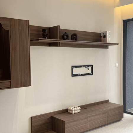 At Alira Metropark, this 990 sq ft home is shaped with a modern approach using black oak and walnut wood textures. The living area features a floor-sitting TV console paired with a streamlined display shelf above, creating a simple yet strong visual statement. A dedicated Indian altar with a pull-out tray is also incorporated for practical use while keeping the design neat and intentional.