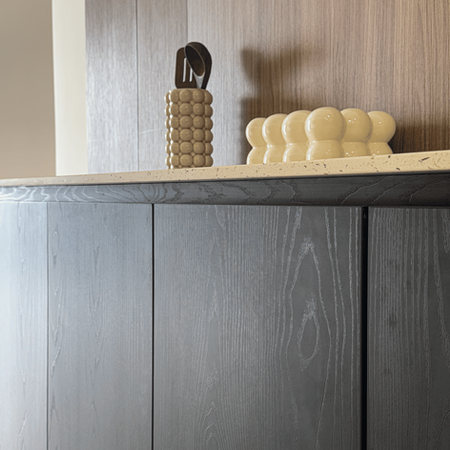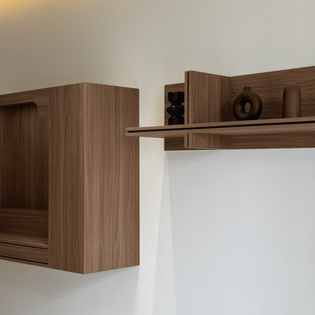 A clean, modern setup designed with black oak and walnut elements, tailored storage, and cohesive detailing across the living, study, and bedroom spaces.
